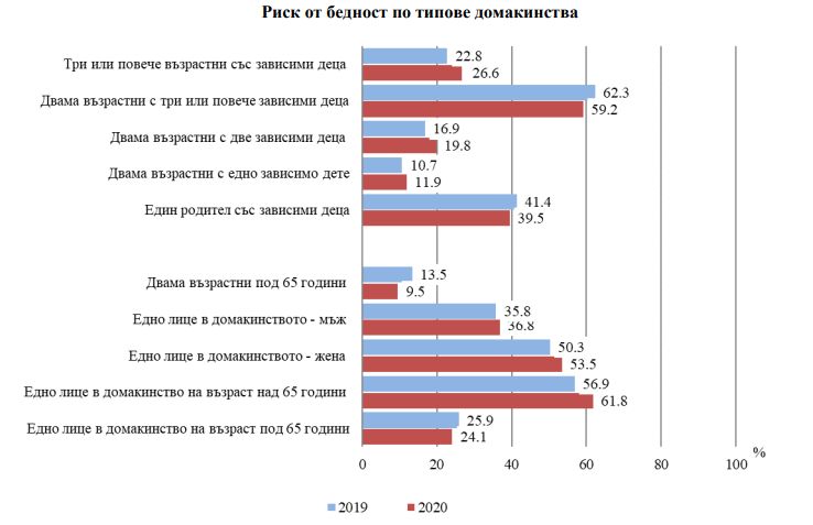 Оценките на бедността в зависимост от типа на домакинството показват, че най-висок е относителният дял на бедните сред едночленните домакинства на възраст над 65 години (61.8% за 2020 г.) и домакинствата с три и повече деца (59.2% за 2020 г.). Най-голямо намаление на риска от бедност през 2020 г. в сравнение с 2019 г. се наблюдава при домакинствата от двама възрастни под 65 години - с 4 процентни пункта.