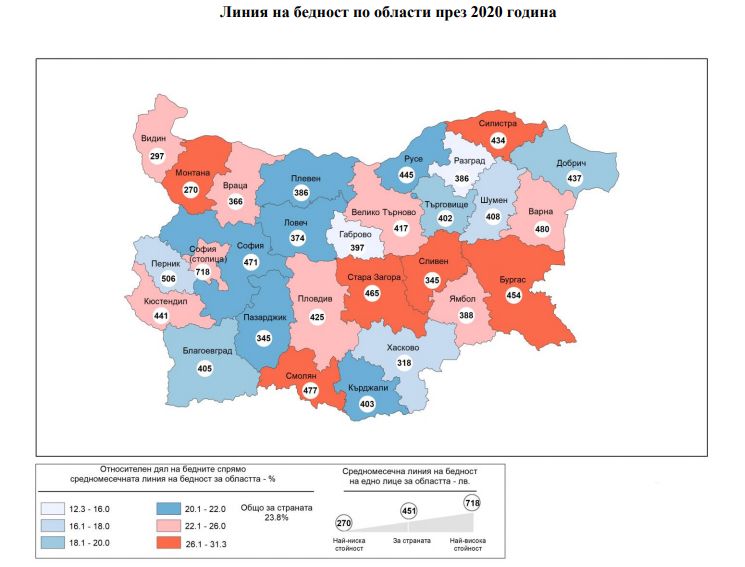 През 2020 г. най-ниската линия на бедност се наблюдава в областите Монтана и Видин - съответно 270 и 297 лв., а най-високата - в област София (столица) (718 лв.), следвана от областите Перник (506 лв.) и Варна (480 лeвa). Най-висок е относителният дял на бедните в областите Сливен - 31.3%, Монтана - 29.4%, Силистра - 29.1%, и Бургас - 29.0%. Най-нисък е относителният дял на бедните в областите Габрово - 12.3%, Разград - 12.6%, и Шумен - 16.4%.