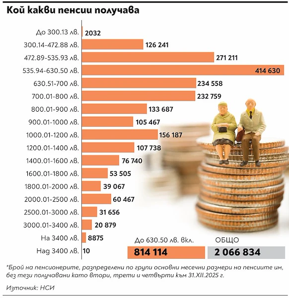Близо половината от пенсионерите в България – общо 941 155 души, получават минимални размери на своите пенсии. Данните от статистическия бюлетин на Националния осигурителен институт (НОИ) за 2025 година разкриват критична зависимост на възрастните хора от най-ниските прагове на осигурителната система. Особено притеснителен е фактът, че близо половин милион от тях имат необходимите стаж и възраст, но въпреки това не надвишават минималните нива.