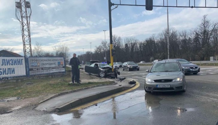 Лек автомобил БМВ се е врязал в светофар малко преди започването на АМ „Тракия“ в посока Пловдив. Цялата предна част на колата е смачкана.