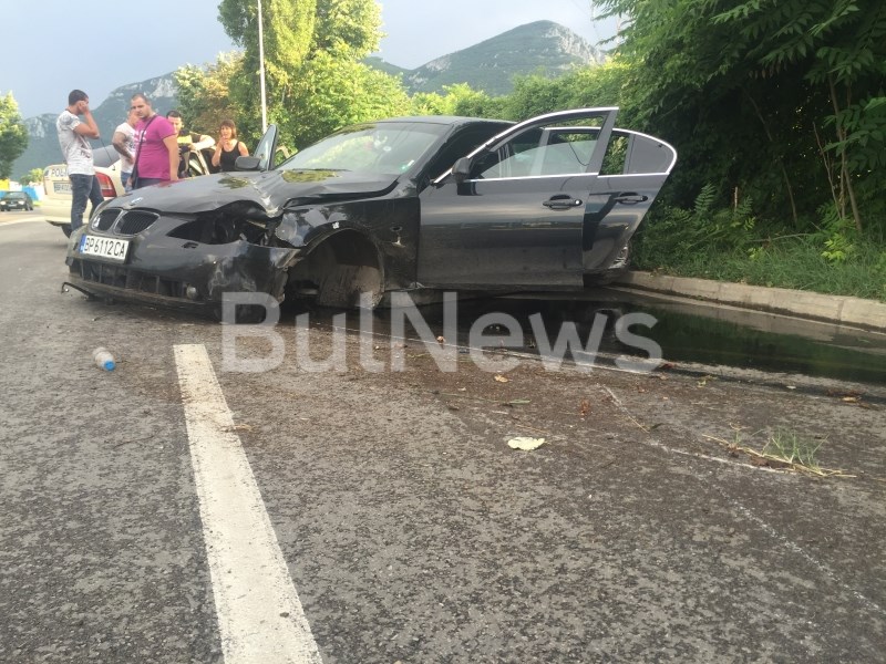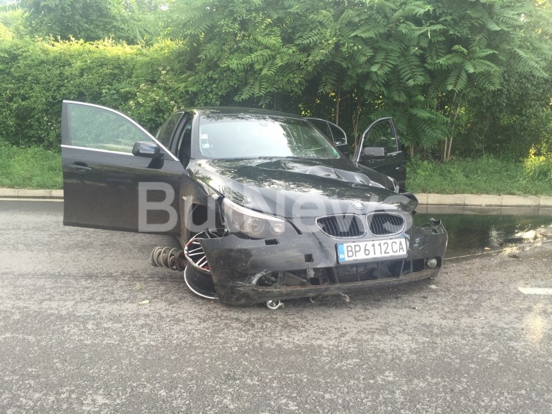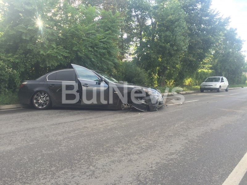 На завоя близо до газ станцията колата е попаднала на аквапланинг, който се е образувал след проливния дъжд днес, завъртяла се е на пътя и се е ударил в бордюра от другата страна на пътя. Предната част на скъпото возило е напълно съсипана от сблъсъка.