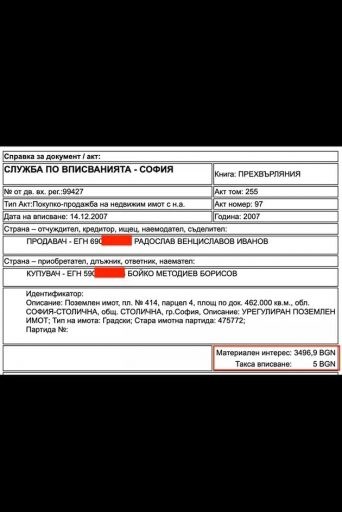 От справка на службата по вписвания става ясно, че през 2007г. Бойко Борисов е придобил парцела (съседен на друг негов) върху който е построена недекларираната къща от своят братовчед Радослав Венциславов Иванов. Декларираната цена за придобиване на имота е 3496,90 лева за УПИ от 462кв.м. или грубо по 4 евро на квадратен метър, което е поне десетократно занижена цена според нивата на реалните пазарни цени към годината на сделката – 2007г. в конкретният жилищен квартал Банкя. Това е класическа симулативна сделка в нарушение на закона с цел укриване на доходи и неплащане на данъци и такси. По-късно върху този парцел е построена и недекларираната къща. Според нас това е направено с цел да се укрие произхода на средствата, с които е извършен строежа на къщата, вероятно защото не може да се докаже техният законен произход, както и да се избегне плащанетона данъци и такси. Към момента на изграждане на къщата и издаването на необходимите разрешителни и документация Бойко Борисов е бил кмет на Община София. И като кмет на Община София той сключва симулативна сделка за закупуване на имот ощетявайки Община София с неплащане на данъци и такси! БОЕЦ изразяваме и своите съмнения, че Бойко Борисов е злоупотребил със служебното си положение, в качеството на кмет на Община София, за да може да извърши сътветната сделка и получи необходимите разрешителни и докумнети за строеж на къщата от 138 кв.м. , която след това не е декларирал пред съответните органи. Както и че е бил в конфикт на интереси при издаване на съответните документи за строежа от служители, които се явяват негови подчинени в общинската и районна администрация. БОЕЦ изискваме от прокуратурата да разпореди данъчна ревизия, като физическо лице на Бойко Медоиев Борисов с цел установяване на произхода на средствата за построяването на въпросната къща – 138 кв.м. РЗП. , която не е декларирал пред Сметната палата.