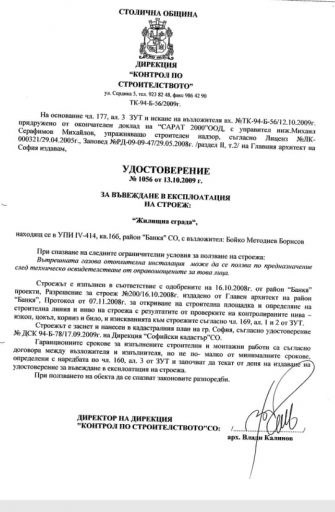 Разрешението за строеж номер 200 е получено на 16 октомври 2008 г. от главен архитект на Банкя. Строителната площадка е открита на 07 ноември 2008 г. Строежът е заснет и нанесен в кадастралния план на София на 17 септември 2009 г. По времето, когато Бойко Борисов е вече премиер.