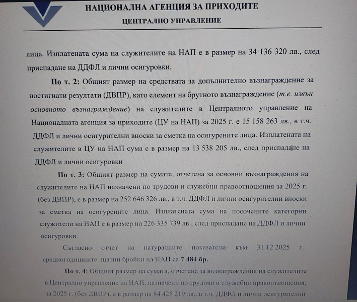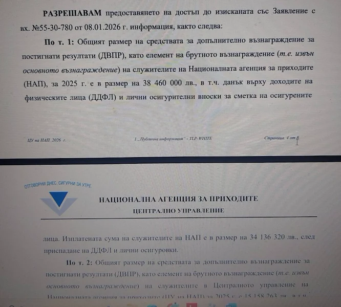 Над 38 милиона лева вероятно са били изплатени от Националната агенция за приходите (НАП) под формата на допълнителни възнаграждения през 2025 година. Тези данни бяха оповестени от гражданско сдружение БОЕЦ, като от организацията твърдят, че информацията е получена след официална справка по Закона за достъп до обществена информация.