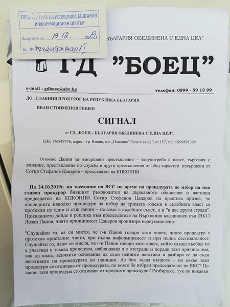 ДНЕС, в първият работен ден на Гешев, като главен прокурор и на Цацаров, като председател на КПКОНПИ, БОЕЦ внесе и първите сигнали до тях! Сезираме Гешев срещу Цацаров за думите на бившият главен прокурор, че избора на тримата големи в съдебната система е ставал в „две други сгради” и че той знае как е ставало това, но нямало да каже. БОЕЦ считаме, че това е признание за търговия с влияние и укривателство и изискваме от Гешев да образува досъдебно производство срещу Цацаров, като инициира и отстраняването му от заеманият пост с цел да не упражнява натиск върху свидетели, да не укрие доказателства и да не влияе върху разследването.