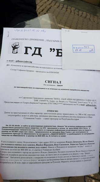 БОЕЦ сезира и Цацаров срещу Гешев за корупция и злоупотреба с власт, като прилагаме разследване на Биволъ, в което бе огласена информация за ВДС (веществено доказателствено средство) по СРС-та приложени и четени по дело НОХД 1552/2014г. в Специализираният наказателен съд, в които се съдържа информация за договорена сума за подкуп в размер на 50 000 (евро или лева) , предназначени за прокурор Иван Гешев с цел осигуряване на минимални присъди за обвиняемите по мегаделото „НЕДОСЕГАЕМИТЕ” и освобождаване на запорираните средства на обвиняемите в размер на 820 000 лв. БОЕЦ изискваме образуването на проверка и КПКОНПИ да сезира компетентните органи (Парламент и ВСС) за процедура по отстраняване на Иван Гешев от заеманият от него пост с цел да не влияе върху свидетели, да не пречи на разследването и да не укрие, или унищожи доказателства!