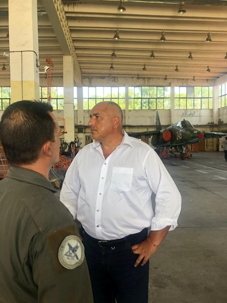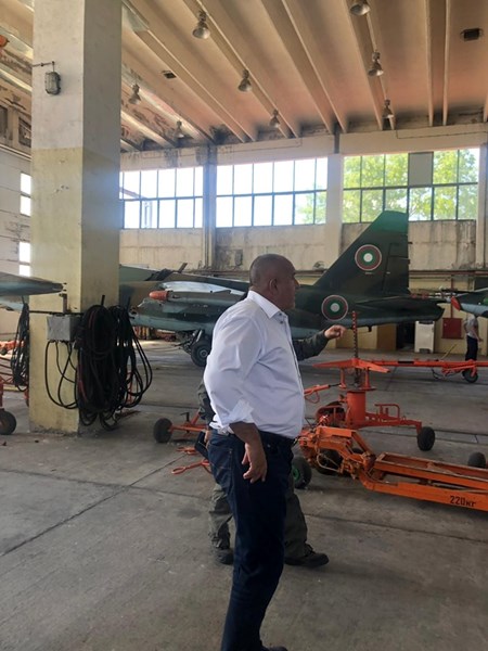 "Посетих авиобаза "Безмер", където се запознах със състоянието на самолетите Су-25. Правителството изпълни своя ангажимент и осигури 82,510 млн. лв. на Министерството на отбраната за ремонта на самолетите", написа премиерът Бойко Борисов във Фейсбук. Заедно с премиера е и финансовият министър Владислав Горанов.