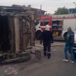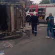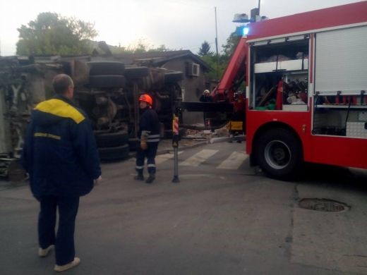 Камионът се движел по улица „Георги Пеячевич“, когато водачът изгубил контрол, врязал се в баничарница и се е преобърнал, обясниха пред БЛИЦ катаджии.