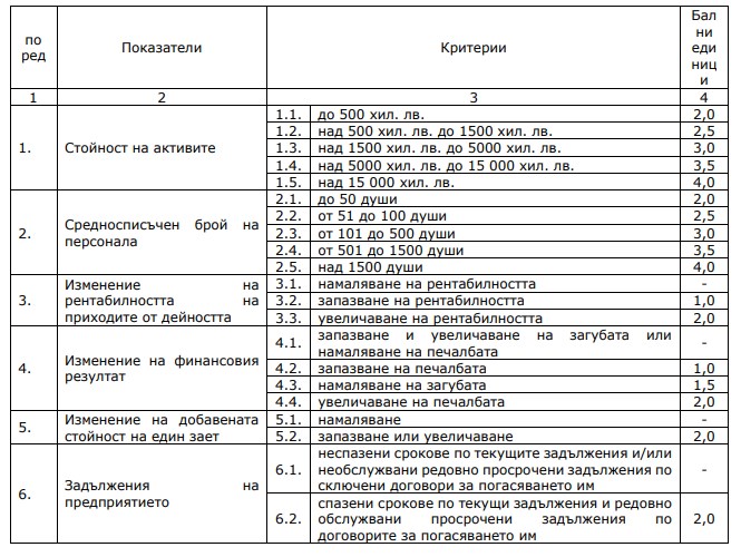 Сборът от бални единици се определя по 6 критерия: стойност на активите, средносписъчен брой на персонала, изменение на рентабилността на приходите, изменение на финансовия резултат, изменение на добавената стойност на един зает и състояние на задълженията на предприятието.