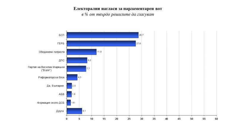 От днешна гледна точка 6 формации са над 4%. Дистанцията между БСП (28,7% сред онези, за които със сигурност може да се очаква да гласуват) и ГЕРБ (27,6%) е в рамките на няколко десетки хиляди гласа. Затова може да се говори за практическо равенство на силите. Трудно е да се определи кой би завършил на първо място в изборите.
