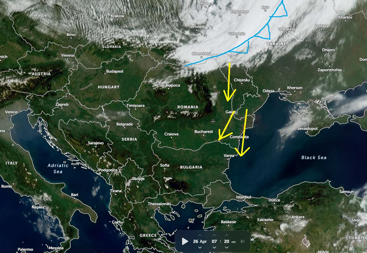 Очаква се студеният фронт да пресече границата ни привечер, като първоначално ще достигне района на Силистра около 18:00–19:00 часа. Вятърът над Североизточна България ще се ориентира рязко от североизток.