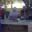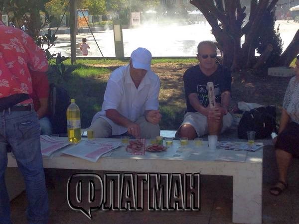Вместо масичка бургазлиите си дръпнали една от бетонните пейки, чиито дупки използват за поставка на пластмасовите чаши с лимонади. Освен това те са опънали и вестник, върху който режат шпеков салам и черпят всеки желаещ. Щедрите пенсионери раздават и вестник "Комунистическо дело" и канят минувачите да се присъединят към тях.
