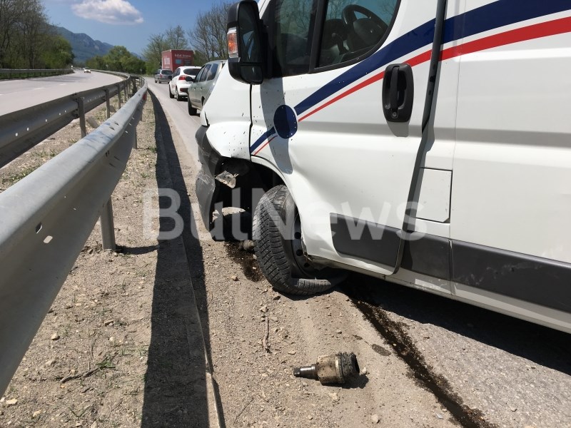 Шофьорът разказа, че по време на движение е гръмнала предната лява гума на „Ситроен“-а, след което загубил контрол над буса и се ударил в мантинелата. Мъжът е превозвал пратки от Мездра към Враца и се е разминал само с ядовете по смачканите ламарини.