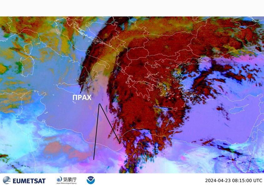 На спътниковото изображение районите с прах са отбелязани с черни стрелки; яркият цикламен цвят показва висока концентрация във въздушната маса над района.