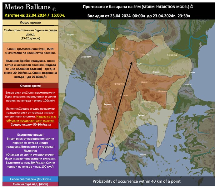 Екипът на Meteo Balkans издаде карта с предупреждения за лошо време, които са валидни за вторник - 23 април 2024г.