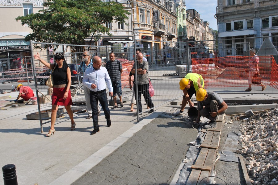 Кметът на Община Русе г-н Пламен Стоилов провери на място днес как протича ремонта по проект „Благоустрояване и достъпна градска среда на централна градска зона – участък от ул. „Александровска“, площад „Батенберг“ и прилежащите пространства“. Главната улица на Русе инспектираха още зам.-кметовете Страхил Карапчански, Свилен Иванов и Димитър Наков, както и главният архитект на Община Русе арх. Живка Бучуковска и изпълнителите по проекта.