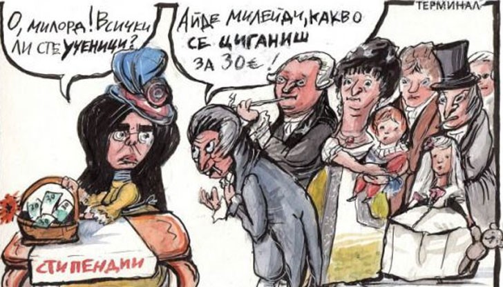 В новата творба ромите, чакащи 30-те евро от образователния министър Меглена Кунева не са голи и боси, а в аристократични облекла от средновековен кралски двор, сподели OFFNews.
