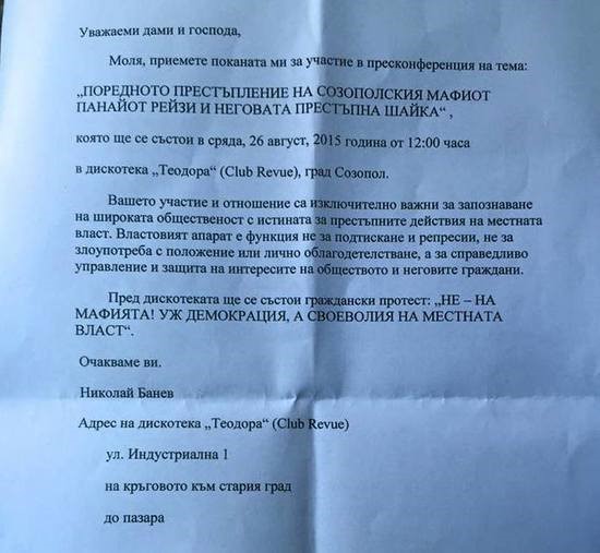 „Днес в 12 часа на обяд трябваше да се състои пресконференция на г-н Николай Банев, която той сам изиска, обяви и разпрати отворено писмо до всички медии, за да ги подкани да присъстват. От тази трибуна той възнамеряваше да сипе жлъч по кмета на град Созопол Панайот Рейзи. Тази проява щеше да мине под мотото: „Крадецът вика - дръжте крадеца!“.