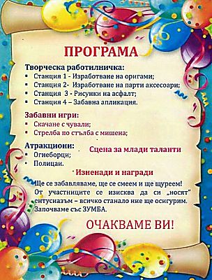 Общоградски празник „При нас е весело!“ организира Общинският детски център за култура и изкуство. Началото е от 17.00 часа пред сградата на Общината. Водеща ще бъде актрисата от ДТ „Сава Огнянов“ Ралица Константинова. Ще има много игри и конкурси и богата концертна програма с формациите на ОбДЦКИ: „Мираж“, „Арт денс класик“, ДВГ „Слънце“, Школа по салса, Фолклорните ансамбли „Здравец“ и „Русчуклийче“, като ще има и традиционната детска дискотека.