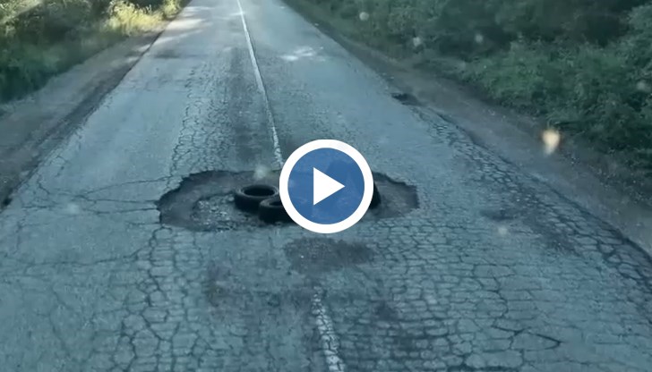 Видеото показва буквално кратер точно в средата на пътното платно, в който преминаващ шофьор е решил да постави четири стари гуми като своеобразна "предпазна мярка". Две от гумите са сложени директно в разбития асфалт, а другите две са подпрени една на друга.
