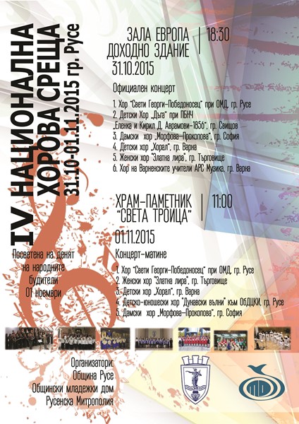 Хоровата среща ще протече в два дни: на 31.10.15 г. от 18:30ч. в зала „Европа” на Доходното здание и на 01.11.15 г. от 11ч. в храм-паметника „Света Троица”.