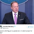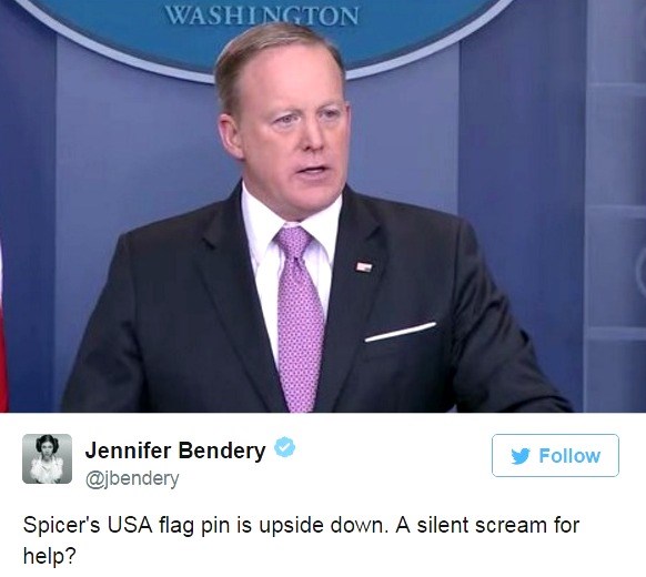 „Значката с флага на Шон Спайсър е обърната. Безмълвен вик за помощ?“, написа потребителка в социалната мрежа Туитър.