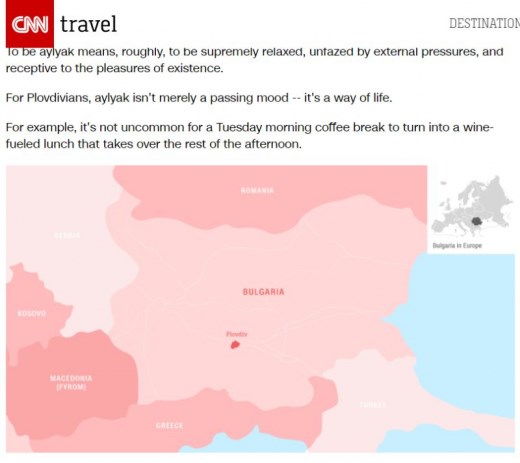 В списъка на журналистът от CNN влизат още Родопите; арт-кварталът "Капана"; Главната, която е сред най-дългите пешеходни улици в Европа; възможността да изпратиш слънцето привечер на някое от тепетата с бира в ръка и динамичният нощен живот.