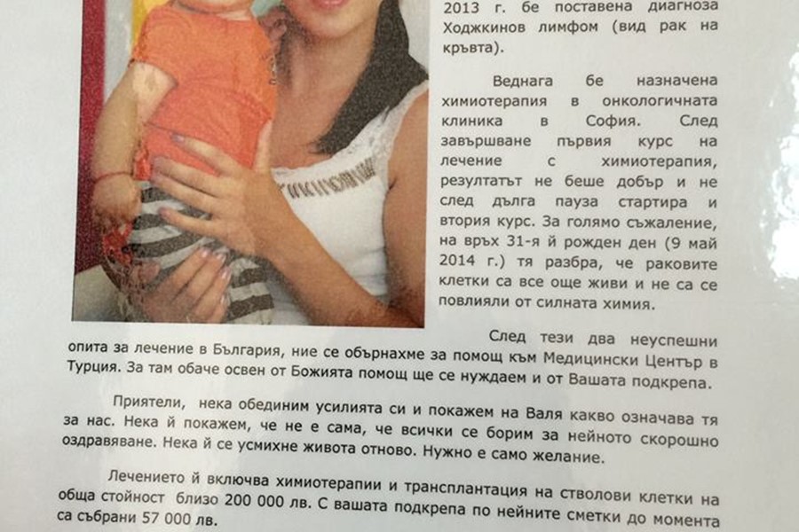 Близки на Валя са се обърнали за помощ към Медицински Център в Турция. За там обаче освен от Божията помощ, ще е нужна и сумата от близо 200 000 лв., с които болната и близките й не разполагат.