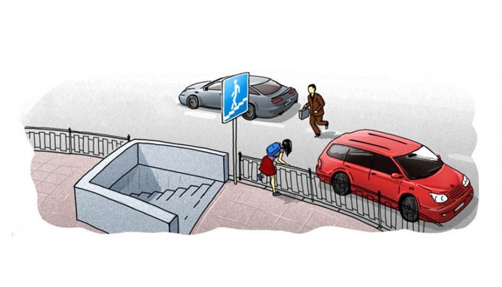 Като осъзнае, че хората няма да минат доброволно през „удобния и безопасен“ подлез, чиновникът започва да поставя заграждения. Това усложнява пътя на пешеходците, но те така или иначе трошат загражденията, минават под/над тях пресичайки където им е удобно.