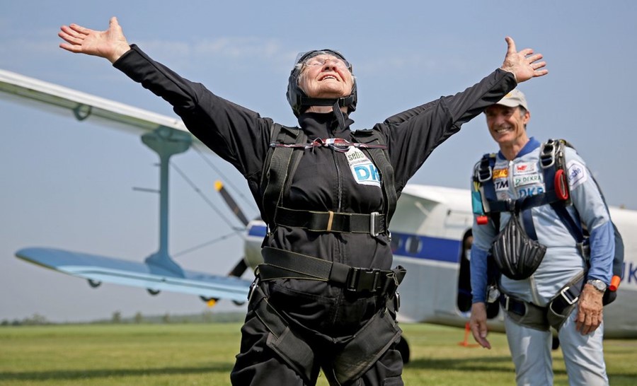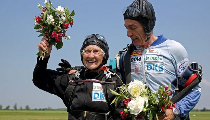 90-годишната Йохана Каас, която според Книгата на рекордите на Гинес е най-старият все още активен атлет в света, участва в тандемен скок с парашут в Германия.