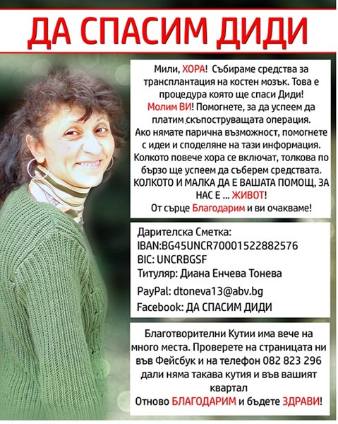 Затова, моля да помогнете да съберем сумата, необходима за операцията на ДИДИ, да помогнем на една майка да отгледа детето си! След тежки химиотерапии сега Диди трябва да събере 110 000 долара за да се лекува в Турция - трансплантация на костен мозък. Касички са разнесени по магазини и книжарници в гр. Русе и гр. Разград.