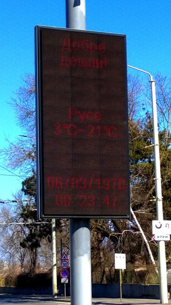"Добре дошли в Русе! 06.03.1970 година! Температура 3 - 21градуса. Часът е 00:23 , а Луната сърдито пече ! Поредните пари на вятъра. Толкова труд за тези табла в Западна промишлена зона, а показват едно голямо нищо! Да не би да е машина на времето?", пита риторично русенецът.