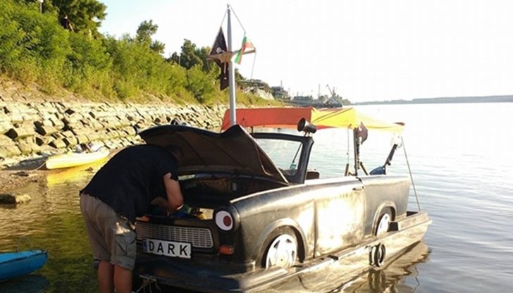 "Пътувам с нея от село Байкал, а крайната ми точка е Силистра. До Русе вече съм изминал около 120-130 км", обяснява 52-годишният Роберт Любенов е от Плевен. "Кризата на 50-те години" ме накара да се заема и да изработя това плавателно средство, което ми отне две години. То представлява водно колело, а върху него е монтирано купе от "Трабант". Има и извънбордов двигател", обяснява Любенов.
