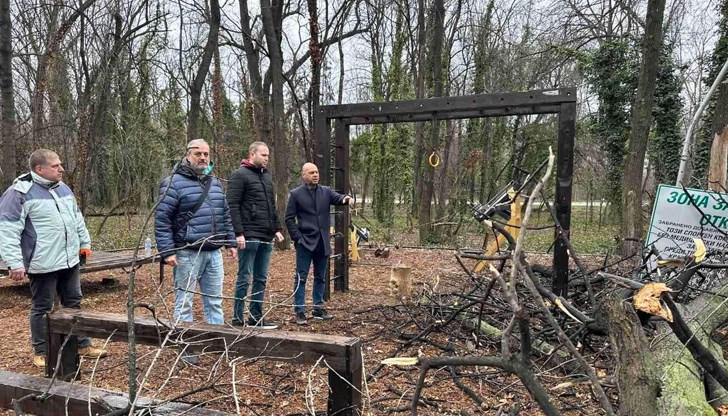 Бригада на Общинско предприятие "Градини и паркове" вече работи по премахването на падналото дърво. От общинската администрация уверяват, че ще бъдат осигурени средства за подмяна на унищожените уреди.