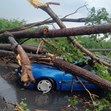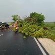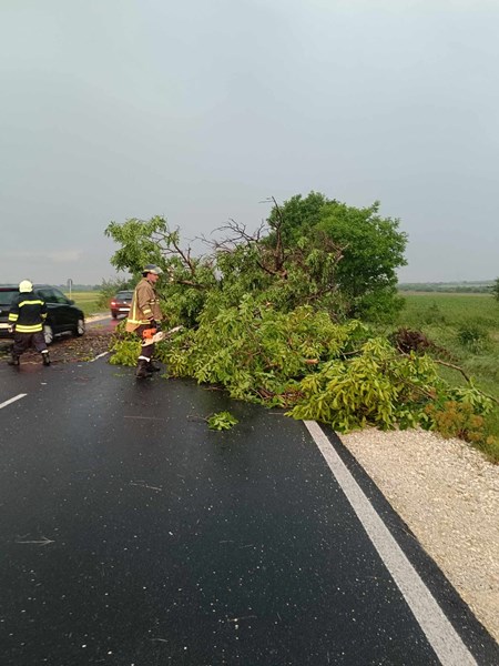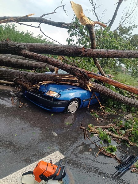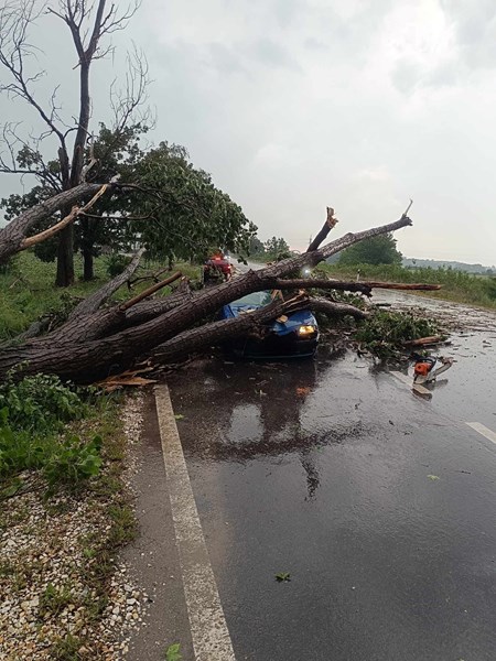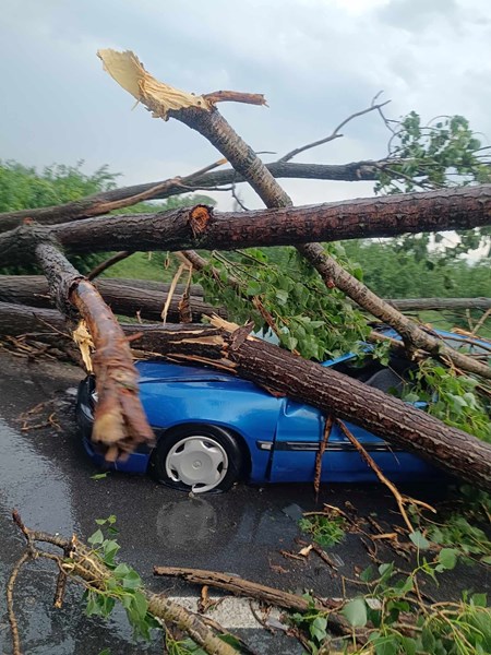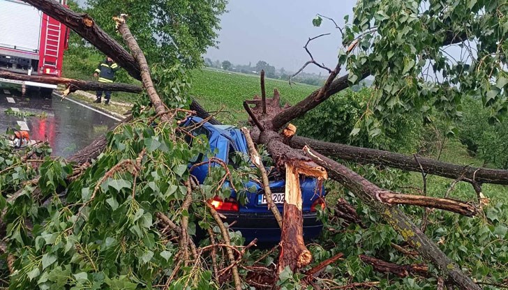 "Чу се силен трясък. Секунди по-късно разбрах, че върху колата ми се стовари огромно дърво. Опитах се да запазя самообладание и излязох през люка. Извадих голям късмет", разказва мъжът пред огнеборците от службата в Садово, които мигновено се притекли на помощ.
