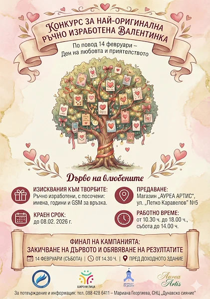 Над 300 ръчно изработени валентинки ще украсят традиционното Дърво на влюбените в центъра на Русе тази събота. Инициативата на сдружение "Дунавско сияние" обединява участници от 5 до 90-годишна възраст, които ще представят своите послания за любовта и приятелството, съобщиха организаторите.