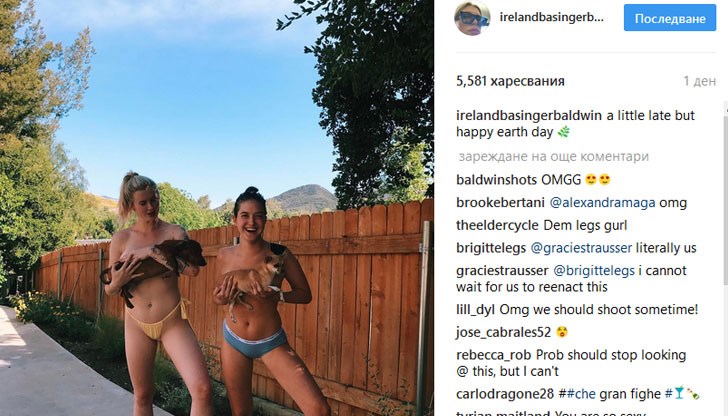 В същата поза е заснета и дъщерята на Стивън Болдуин. 21-годишната Айрланд Болдуин и 24-годишната Алания Болдуин позират без притеснение, заедно с кучетата си.