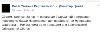 "Сбогом, татенце! За нас ти винаги ще бъдеш най-прекрасния неповторим баща! На рождения ден на Митето , ти му предаде щафетата.... Никога няма да те предадем или разочароваме! Обичаме те! Сбогом!"