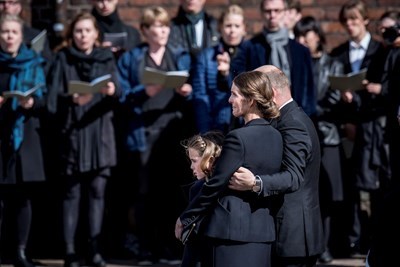 Бизнесменът, съпругата му Ан и дъщеря им Астрид бяха неотлъчно до ковчезите на загиналите Алфред, Алма и Агнес в катедралата "Аарус" в Дания, пише "Дейли мейл", предаде 24 часа.