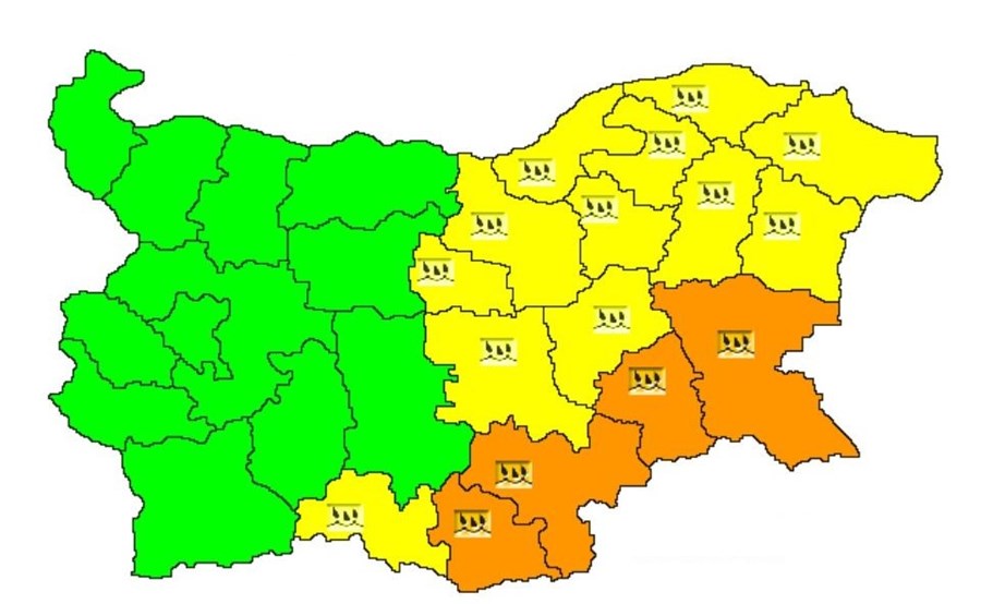 Също така жълт код за опасно време е обявен за 12 области - Смолян, Стара Загора, Сливен, Габрово, Велико Търново, Търговище, Русе, Разград, Шумен, Варна, Добрич, Силистра.