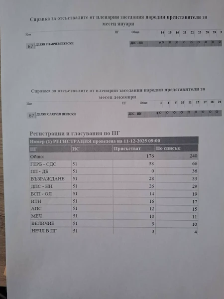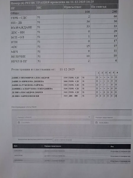 Проверката обхваща месеците декември 2025 година и януари 2026 година. Данните от информационната система показват, че Пеевски има само едно неизвинено отсъствие през декември - на 11 декември, въпреки че в този ден е бил регистриран, но заседанието впоследствие се е провалило. За същия месец той е посетил сградата на парламента поне още три пъти (на 3, 17 и 19 декември), без да влезе в пленарната зала, но тези негови отсъствия са били официално извинени.