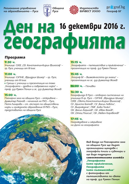 Регионално управление на образованието – Русе и Географ БГ с подкрепата на община Русе организират на 16.12.2016 г. Ден на географията в Русе.