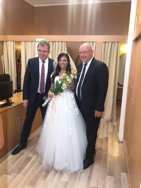 Двамата си казаха “да” в ритуална зала в София в събота в много тесен семеен кръг. На тържеството присъстваха синът на Деси от първия ѝ брак Янчо Таков и кумовете - шеф Иван Манчев и близката приятелка на Цонева - Маргарита, сподели 24 часа.