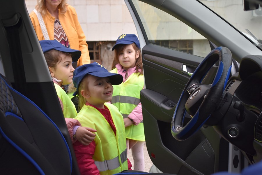 Децата първо посетиха полицейското управление, където бяха посрещнати от полицейските инспектори Мирослав Драгнев и Хасан Баки, както и от инспектор Любослав Данев от Детска педагогическа стая. Служителите на реда запознаха малчуганите с важна информация за безопасността и им предоставиха възможност да разгледат отблизо полицейски автомобил.