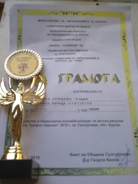 С творбите си от рисувана коприна 9-годишната Асена Арифова се класира на трето място на Националния конкурс-изложба за детска рисунка „Свети Трифон Зарезан” в Сунгурларе. За доброто си представяне малката Асена получи грамота и статуетка.
