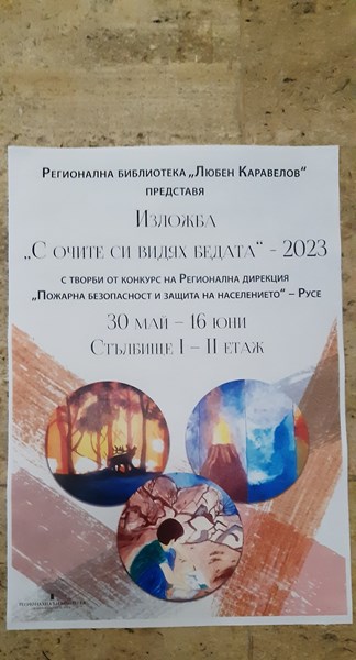 По случай 1 юни – Деня на детето, Регионална дирекция „Пожарна безопасност и защита на населението“ – Русе гостува в библиотеката с изложба от най-хубавите творби в областния етап на международния конкурс за детска рисунка „С очите си видях бедата”– 2023. Те са рисувани от ученици от 11 общообразователни училища в Русенска област и деца от две детски градини.