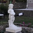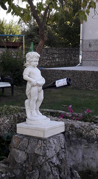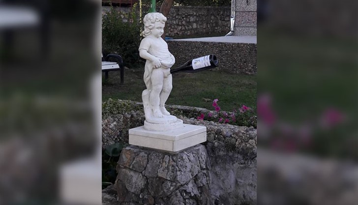 Неизвестни вандали са поставили бутилка от вино върху красивата статуя, разположена в средата на площадката.
