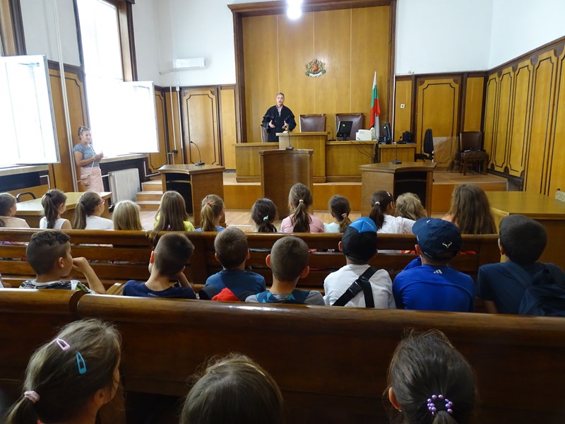 В началото на посещението бяха запознати с правилата за влизане и поведение в съдебните сгради. Сами се убедиха, че всеки опит за влизане в съда с непозволени предмети бива предотвратяван от органите на съдебната охрана, чиято важна функция е да следи за реда и сигурността в сградата на Темида. В съдебна зала № 1 научиха за символите там, за съдийската тога и за мястото на всеки участник в един съдебен процес. Съдия Бойчев им обясни различните видове наказания, които се налагат на подсъдимите, както и ролята на съдебните заседатели. Той отговори на достъпен език на многобройните им въпроси, които не спираха и след края на предвиденото за срещата време. Децата разгледаха и Мраморната зала, която ги впечатли с внушителния си вид и цветните стъклописи.