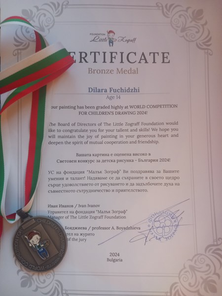 Картината "Пробуждане" на младата художничка получи бронзово отличие в единадесетото издание на Световния конкурс за детска рисунка "Малък зограф" 2024 година. В надпреварата участваха над 6000 творби от 80 държави.