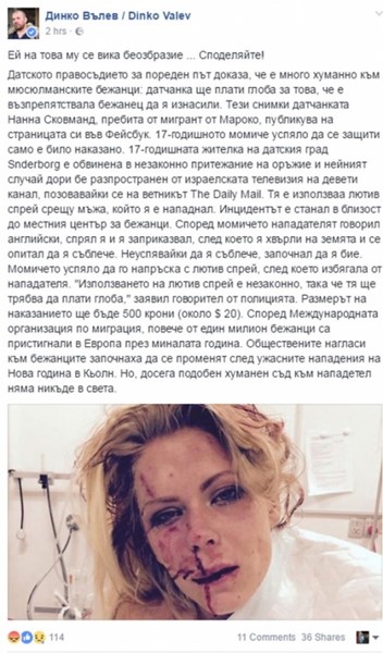Датското правосъдието за пореден път доказа, че е много хуманно към мюсюлманските бежанци: датчанка ще плати глоба за това, че е възпрепятствала бежанец да я изнасили. Тези снимки датчанката Нанна Сковманд, пребита от мигрант от Мароко, публикува на страницата си във Фейсбук. 17-годишното момиче успяло да се защити само и е било наказано.
